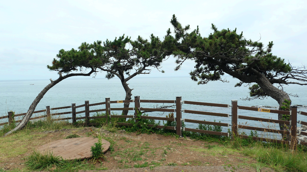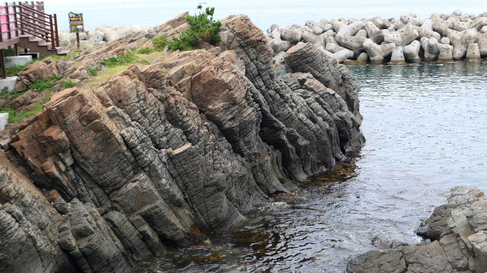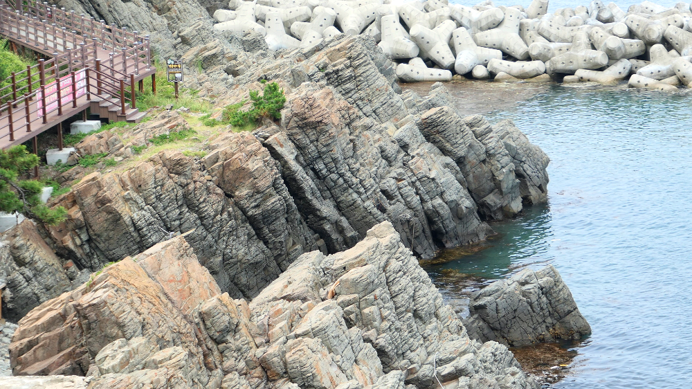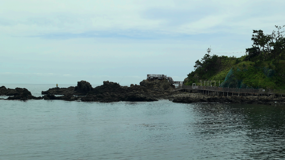 우가마을에서 정자항 방향으로 데크길이 있고 절벽아래 주상절리 갯바위섬이 이뻐서 내려가보기로 한다