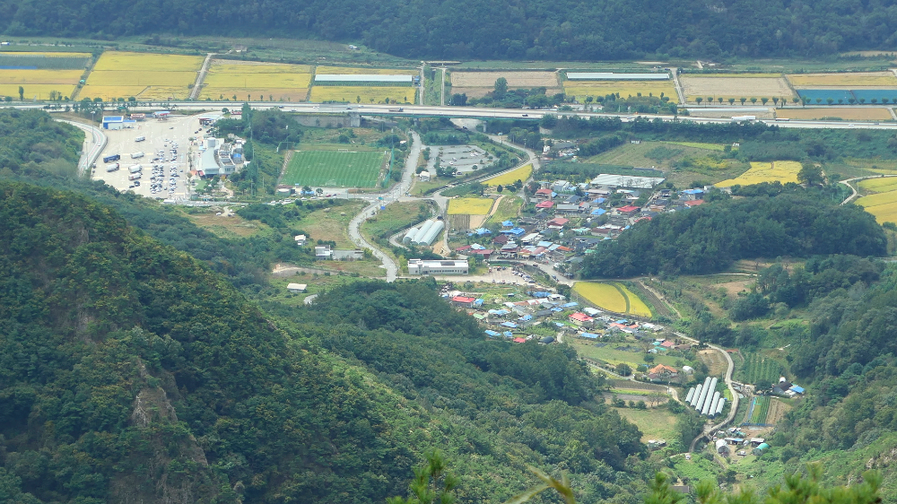 속리산휴게소와 적암마을이 산행내내 조망이 된다